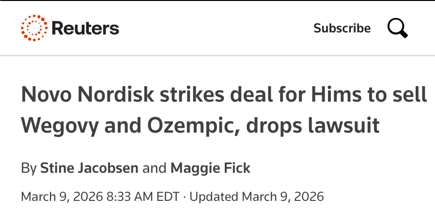 If you’ve been reading this newsletter, you know I’ve been closely tracking the ongoing battle between Novo Nordisk and Hims for months now. It’s one of the most important stories in American healthcare.