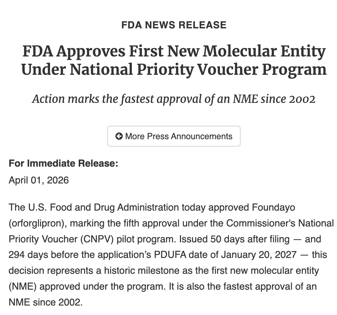 The FDA approved Foundayo at record speed—one of the fastest approvals of its kind in over two decades. It was the first “New Molecular Entity” approved under the “Commissioner’s National Priority Voucher Program”.