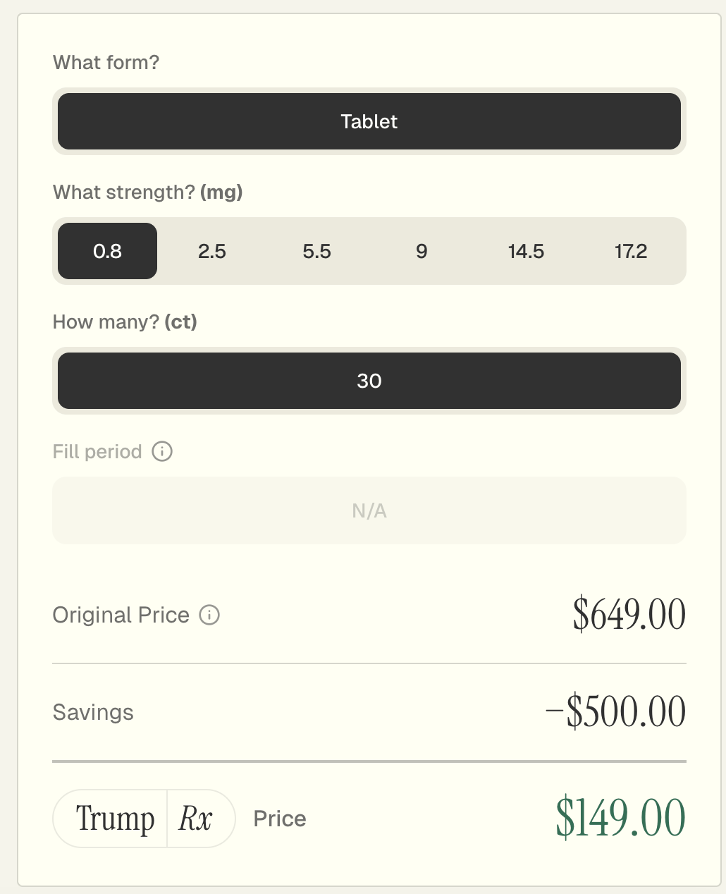 …a bit of detective work (shoutout to Brian Reid) shows that TrumpRx currently lists Foundayo at a $649 monthly list price, with direct-to-consumer patients paying around $149 per month.